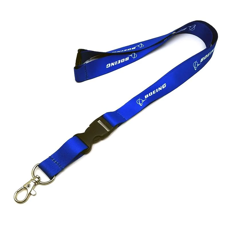 Blue Boeing lanyard with sublimated logo on both sides. Features safety breakaway at the neck, detachable buckle, and metal hook for ID or keys. Made of polyester, zinc alloy, and plastic. Hand wash only.