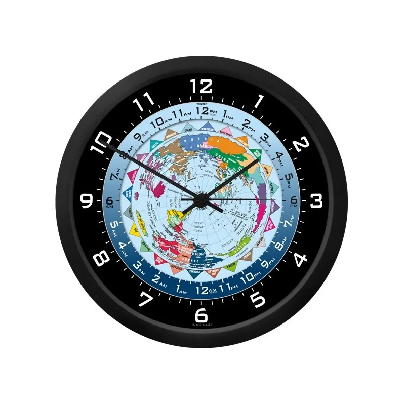 Ya sea porque necesitas saber la hora en el otro lado del país o al otro lado del mundo, este es tu reloj. Este reloj de pared único ofrece un mapa del mundo con las 24 principales zonas horarias que gira todo el día, junto con la Tierra. Las agujas del reloj apuntan a la escala de tiempo externa que proporciona la hora local, mientras que la escala de tiempo interna le permite saber la hora en cualquier parte del mundo. Marco de plástico negro y lente de plástico transparente. Se requiere una pila AA (se recomienda utilizar una pila alcalina de alta calidad para un mejor rendimiento).